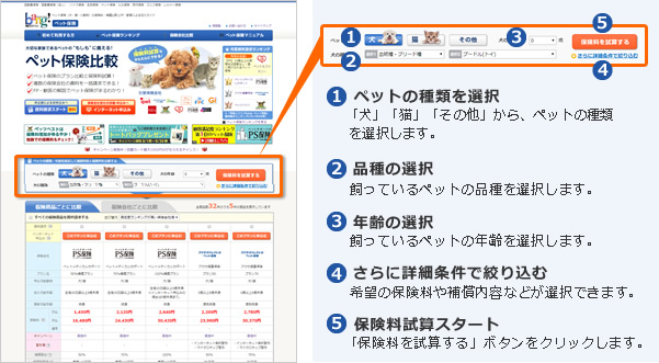 を選び、ボタンをクリックするだけで、それぞれのペット保険の保険料とそれに伴う補償内容を表示してくれます。