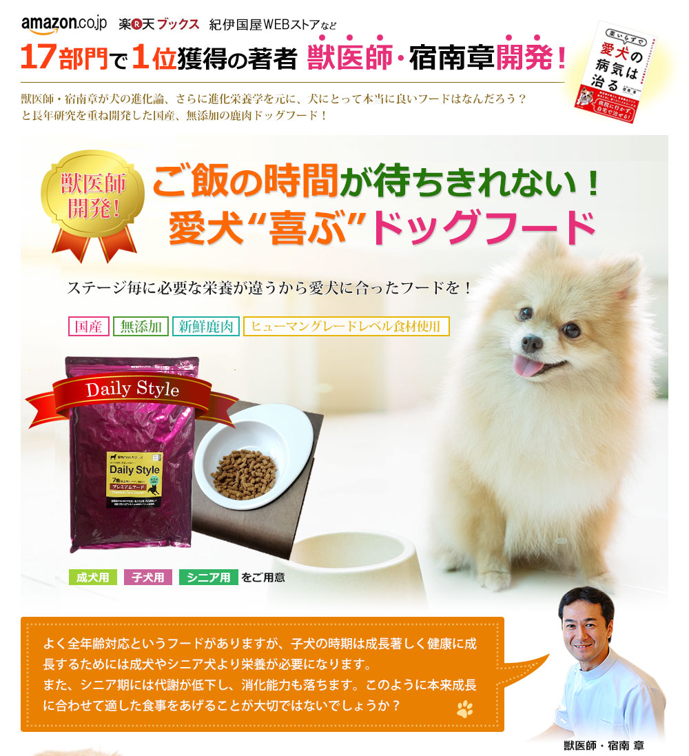 デイリースタイルのプレミアムドッグフードは、Amazonや楽天で高評価を得ている「愛犬の病気は治る」の著者である獣医師の宿南章氏が開発したドッグフードです。