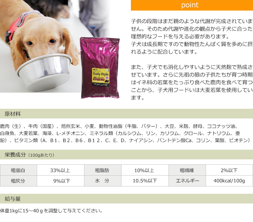 子犬用ドッグフードの特徴は、まだ成犬のように代謝が完成されていないため、それに合ったドッグフードが必要であり、また、成長期にあたる子犬は、より多くの動物性たんぱく質が必要となるため、他の2種類と比べて動物性たんぱく質が多く含まれています。