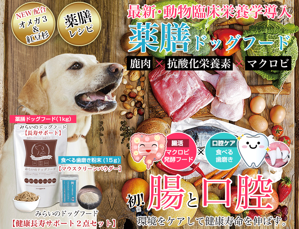 みらいのドッグフード【長寿サポート】は、獣医師とペット栄養管理士が監修して作り上げた薬膳ドッグフードです。