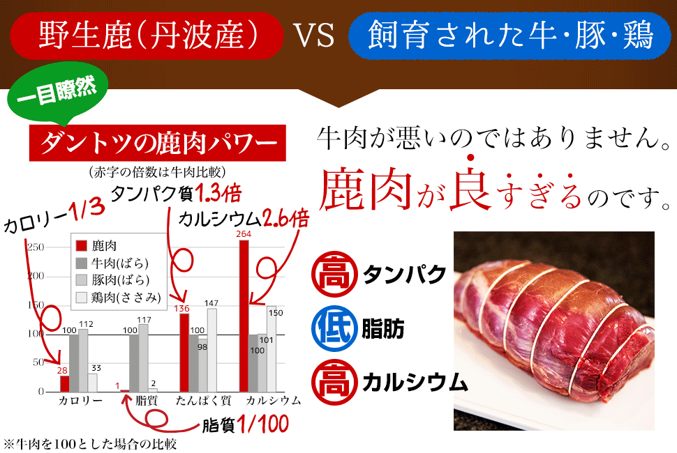 使用している鹿肉は、丹波産の野生の鹿で、その栄養価を牛肉と比較すると、