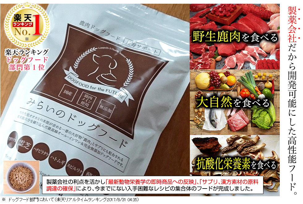 そのようなことから、その効果が高く評価され、数多くのドッグフードが楽天市場で販売されている中、ドッグフード部門ランキング第一位(2017年8月31日 他多数)を獲得するまでになっていて、多くの愛犬家さん達にしっかりと認められているプレミアムドッグフードとなりました。