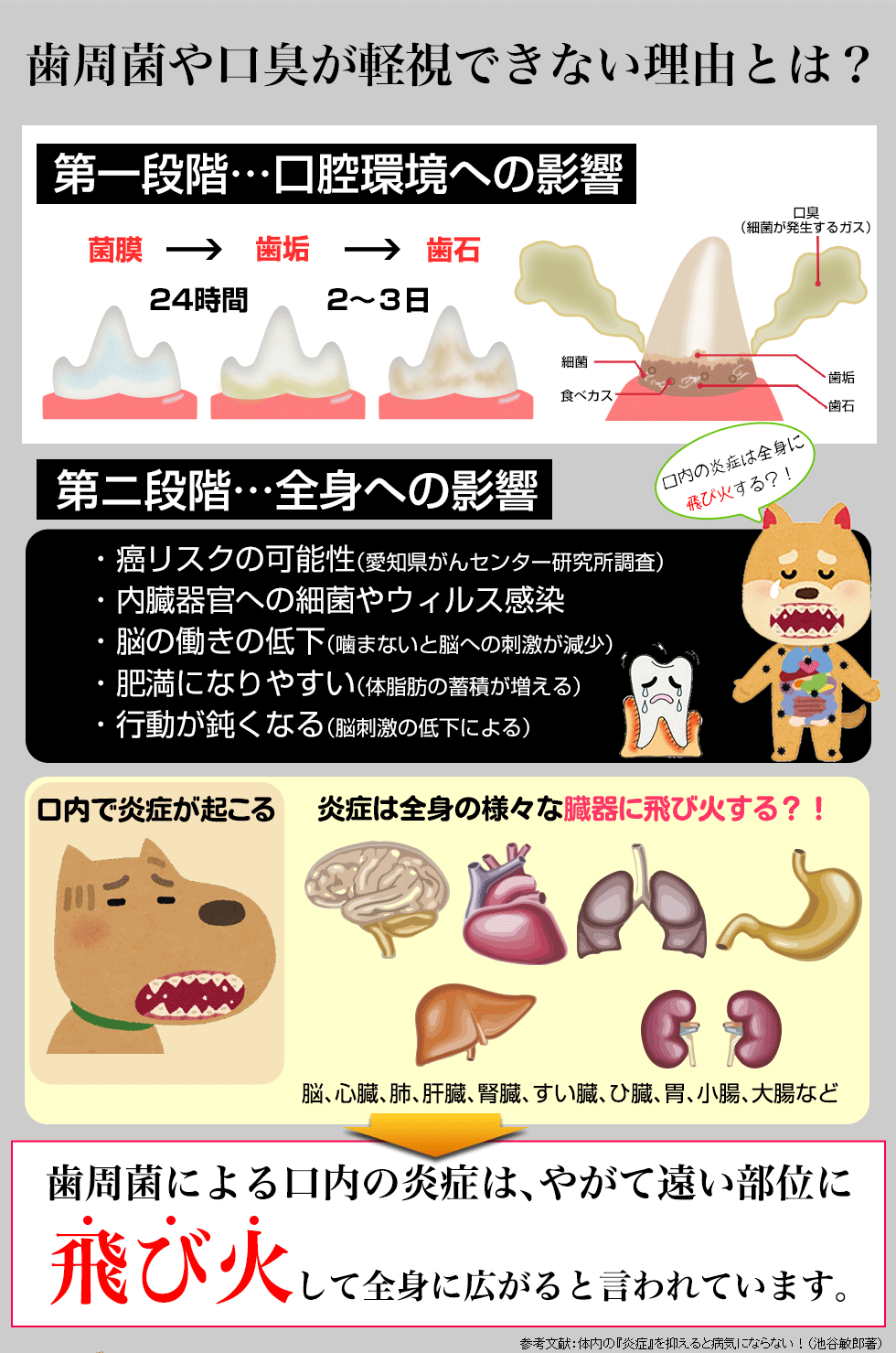 口腔環境というのは、むし歯や歯周病などで歯がやられ、ドッグフードを噛むことが難しくなり、栄養補給に影響が出るというだけでなく、消化器などの内臓や脳の働きに影響が出るなど、カラダの様々なところに悪影響を与えるので、しっかりと整える必要があるのです。
